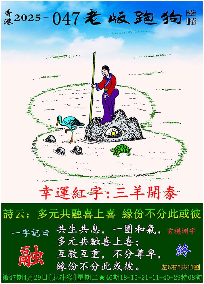 047期老版跑狗一字記之曰:【融】 詩雲:多元共融喜上喜,緣份不分此或彼。