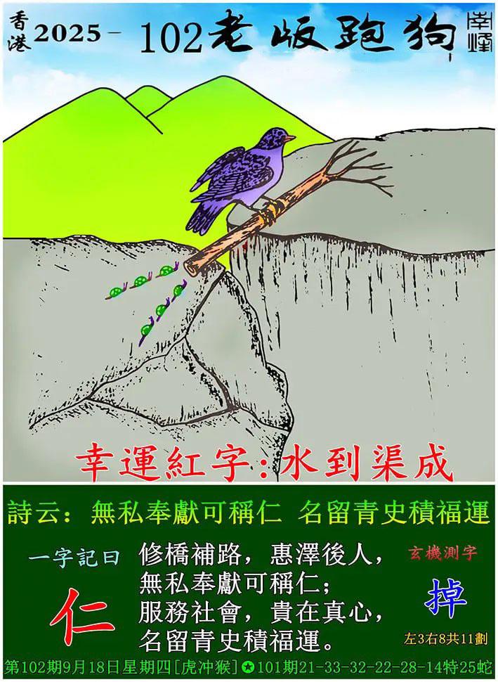 102期老版跑狗一字記之曰:【仁】 詩雲:無私奉獻可稱仁,名留青史積福運。