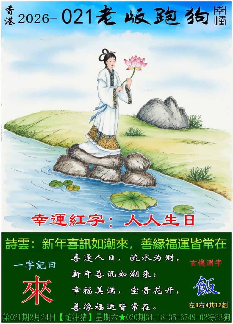 021期老版跑狗一字記之曰:【來】 詩雲:新年喜訊如潮來,善緣福運皆常在