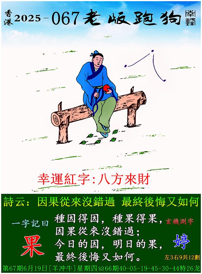 067期老版跑狗一字記之曰:【果】 詩雲:因果從來沒錯過,最終後悔又如何。