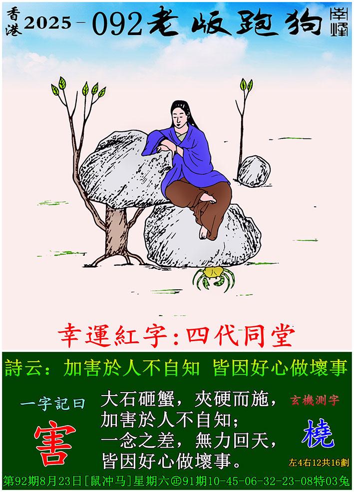 092期老版跑狗一字記之曰:【害】 詩雲:加害於人不自知,皆因好心做壞事。