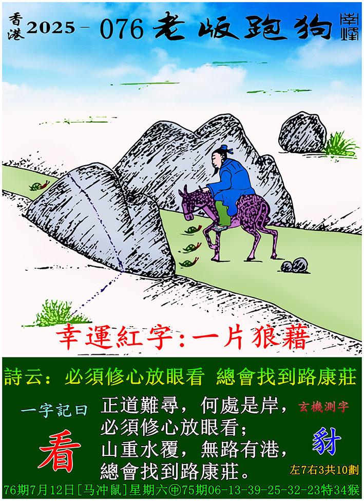 076期老版跑狗一字記之曰:【看】 詩雲:必須修心放眼看,總會找到路康莊。
