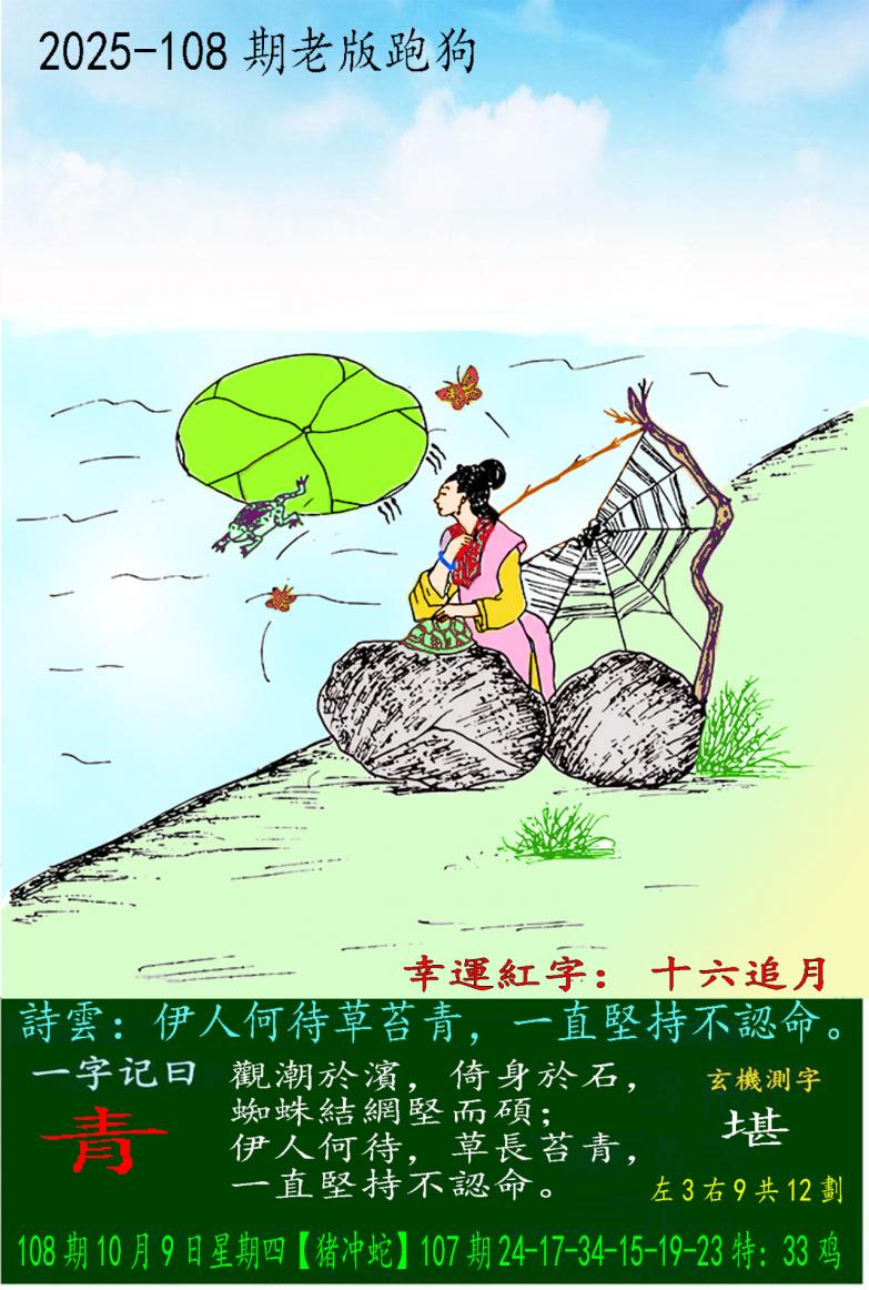 108期老版跑狗一字記之曰:【青】 詩雲:伊人何待草苔青,一直堅持不認命。
