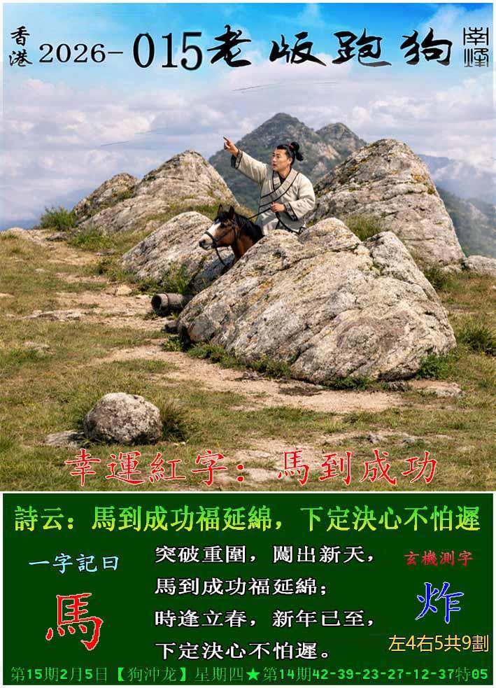 015期老版跑狗一字記之曰:【馬】 詩雲:馬到成功福延綿,下定決心不怕遲。