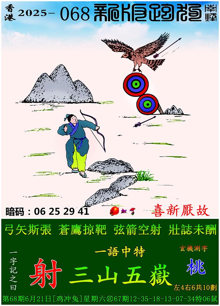068期新版跑狗一字記之曰:【射】 玄機測字:《桃》 一語中特:三山五嶽