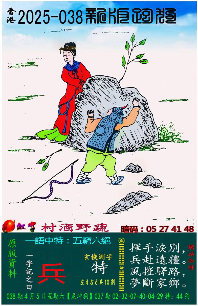 038期新版跑狗一字記之曰:【兵】玄機測字:《特》 一語中特:五窮六絕
