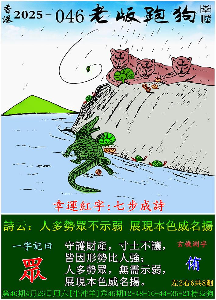 046期老版跑狗一字記之曰:【眾】 詩雲:人多勢眾不示弱,展現本色威名揚。