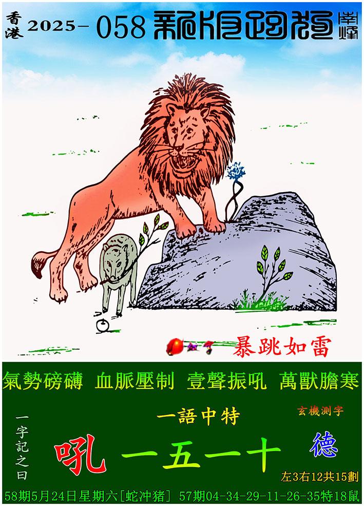 058期新版跑狗一字記之曰:【吼】 玄機測字:《德》 一語中特:一五一十
