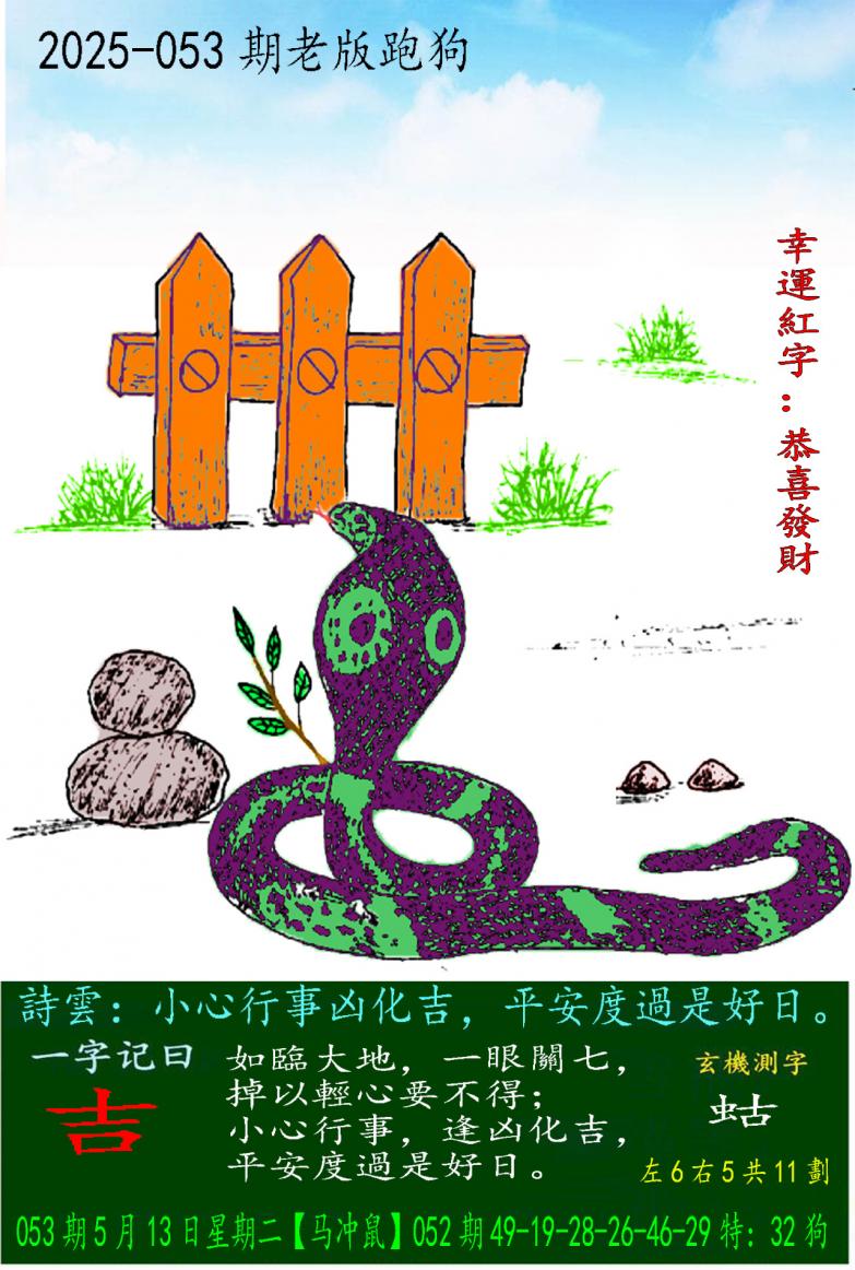 053期老版跑狗一字記之曰:【吉】 詩雲:小心行事凶化吉,平安度過是好日。