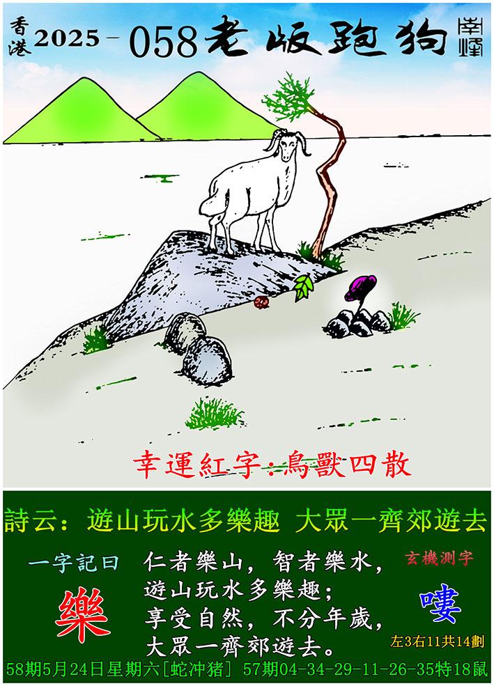 058期老版跑狗一字記之曰:【樂】 詩雲:遊山玩水多樂趣,大眾一齊郊遊去。