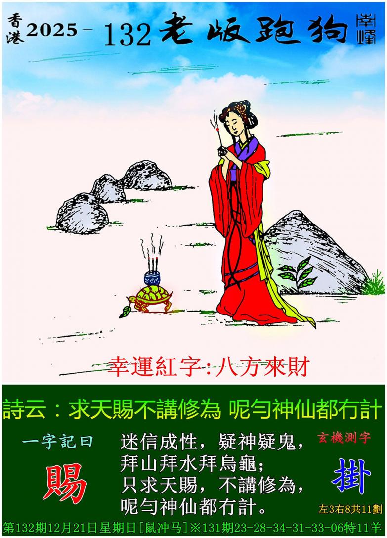 132期老版跑狗一字記之曰:【賜】 詩雲:求天賜不講修為,呢勻神仙都冇計。