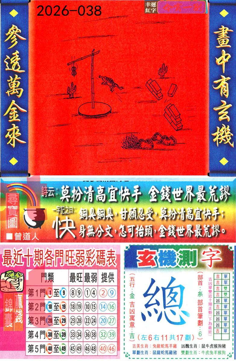038期老版跑狗一字記之曰:【快】 詩雲:莫扮清高宜快手,金錢世界最荒謬。