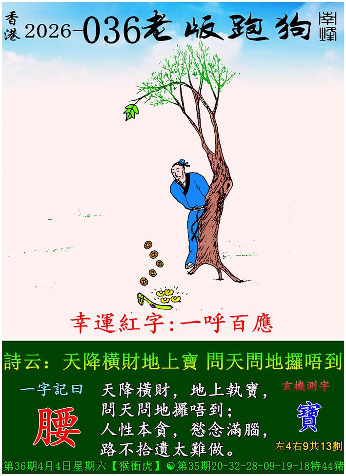 036期老版跑狗一字記之曰:【腰】 詩雲:天降橫財地上寶,問天問地攞唔到。